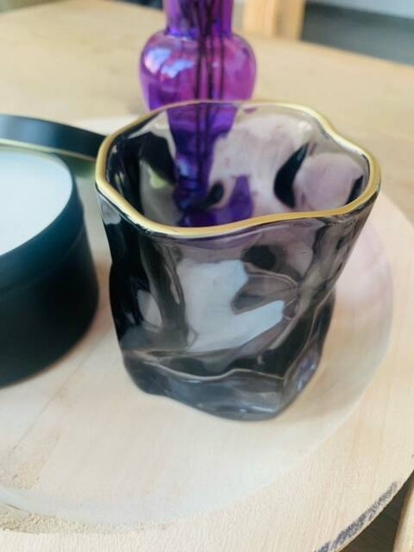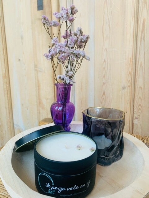 Plankje met koolzaadkaarsje met etherische olie naar keuze en zwart glazen theelichthouder met natuurlijk theelichtje. Vaasje is een kaarsenhouder.