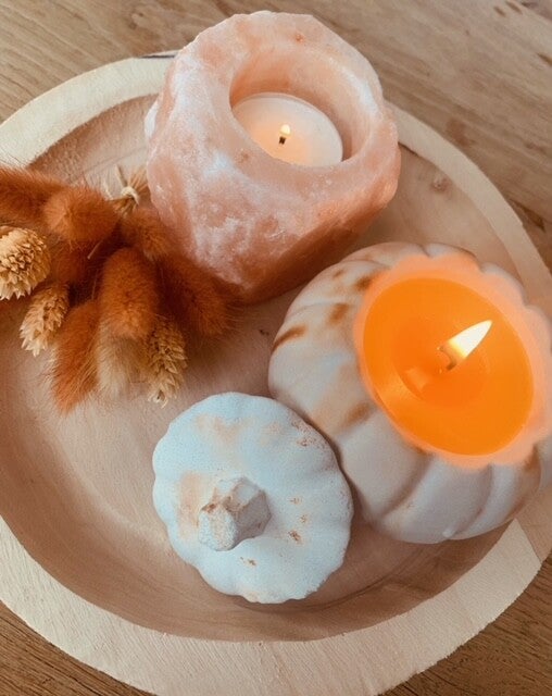 Bestaande uit een pompoen-shaped kaars 110ml koolzaadwas. Zoutsteen T-lichthouder met T-lichtje. Trosje droogbloemen op een sfeervolle houten plank.
