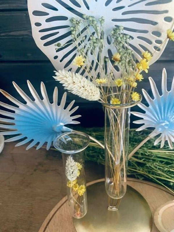 Houten onderlegger met unieke metalen proefbuishouder met gedroogde bloemen. Daarbij koolzaadwaskaars "Lenteochtend". (Etherische olie van Lemongraas en Jeneverbes) .150ml