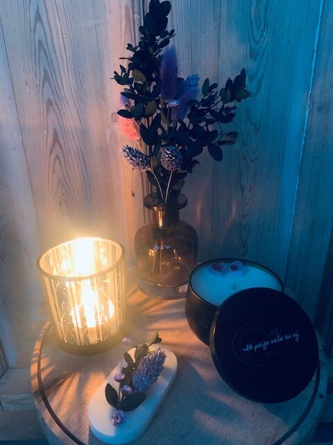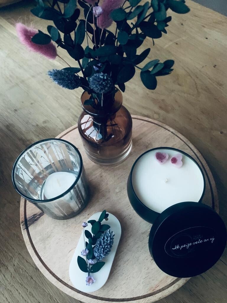 - Een handgemaakte wasmelt met dezelfde etherische olie en versierd met droogbloemen. (Deze kan ook gesmolten worden in een wasbrander of in je kleerkast opgehangen worden).