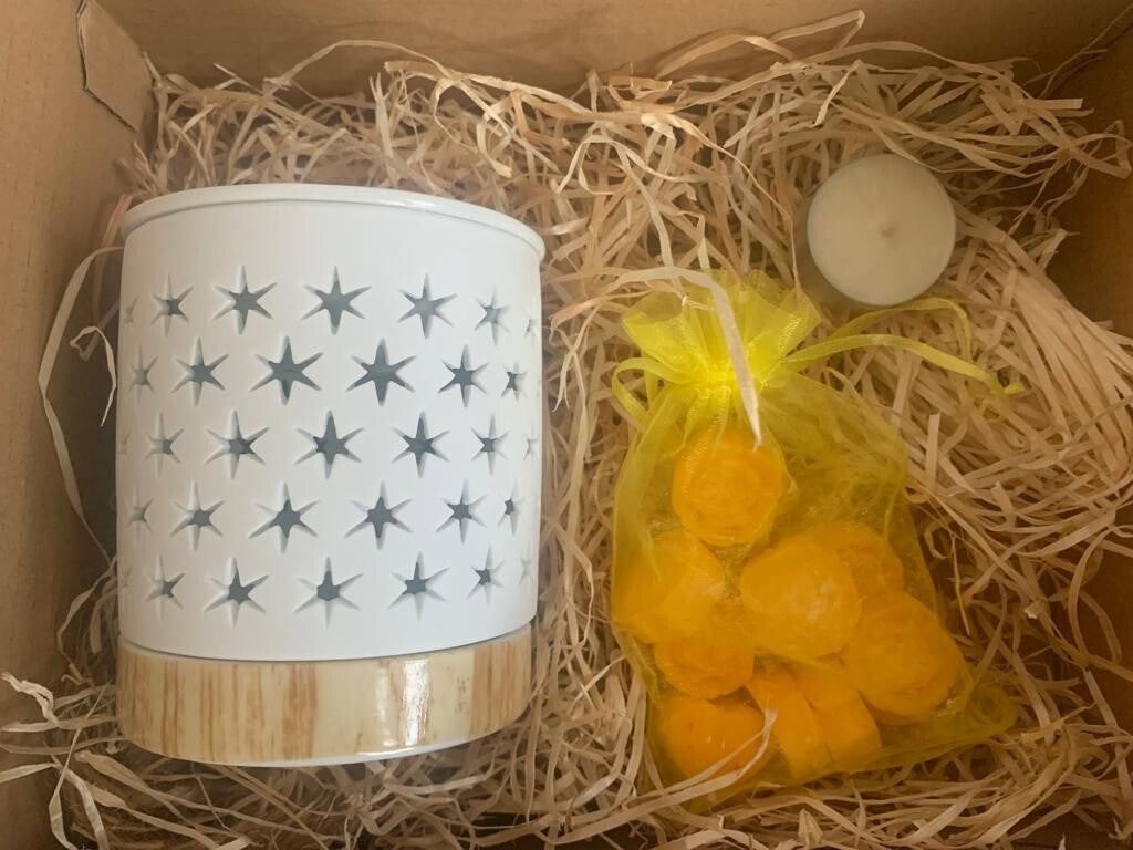 Geschenkje bestaand uit een grote waxmelt brander, een bijhorend theelichtje en een setje van 10 waxmelts met EO (citrus en sinaasgeur)